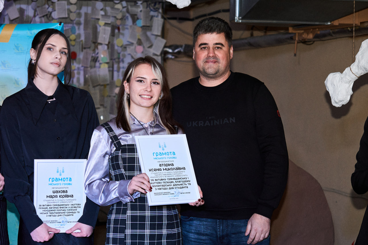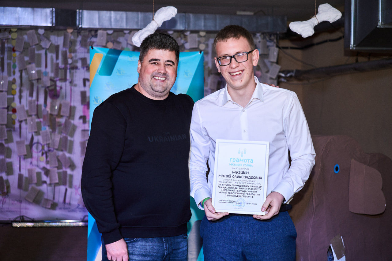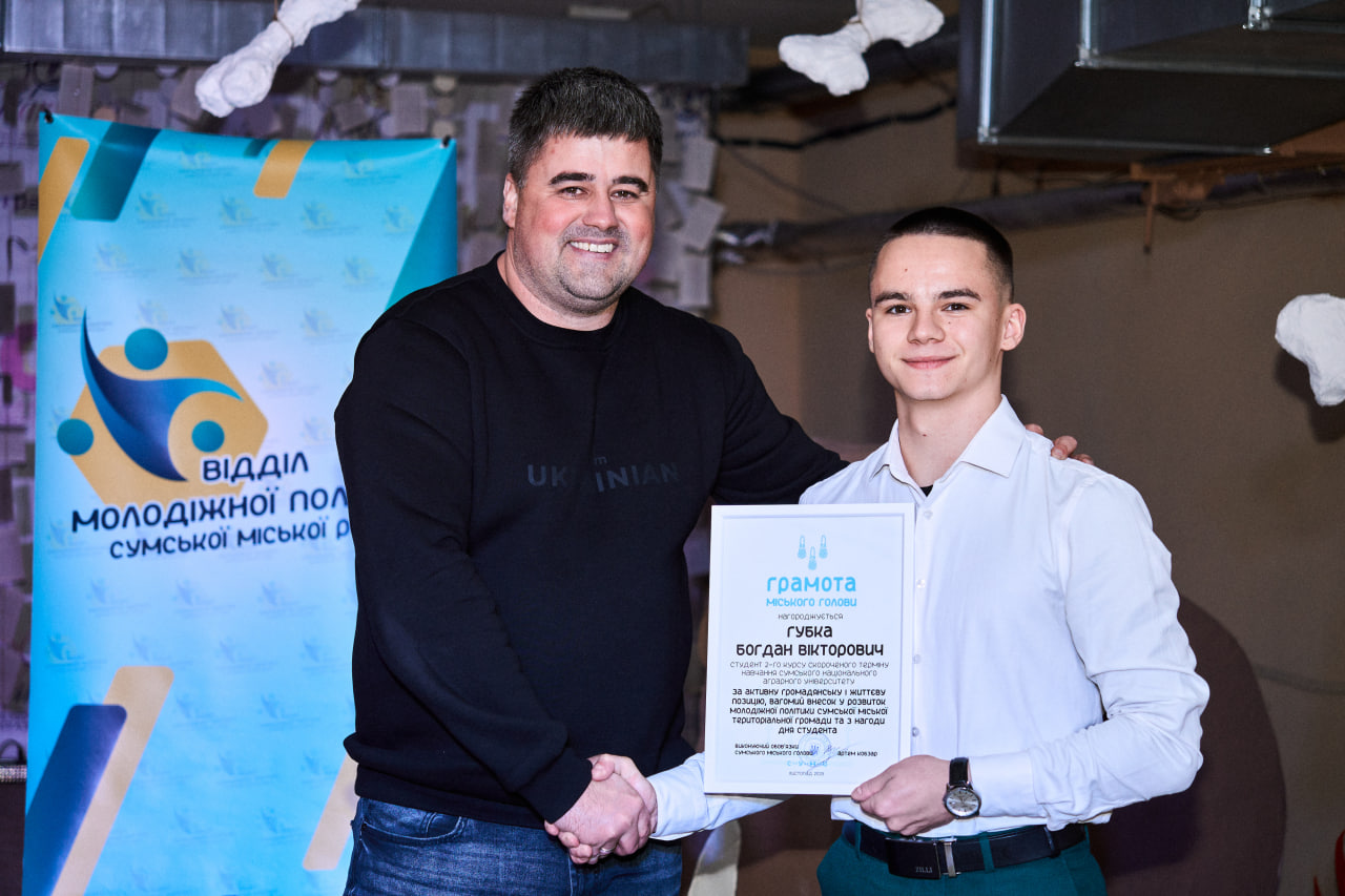 На завершення заходу студенти Сумського національного аграрного університету були нагороджені грамотами міського голови за активну громадську позицію, вагомий внесок у розвиток Сумської міської територіальної громади та волонтерську діяльність. Серед відзначених — студент інженерно-технологічного факультету Богдан Губка, студент юридичного факультету Матвій Музикін та студентка факультету агротехнологій та природокористування Ксенія Аторіна, які є активними представниками студентського самоврядування та профспілкової організації студентів СНАУ.