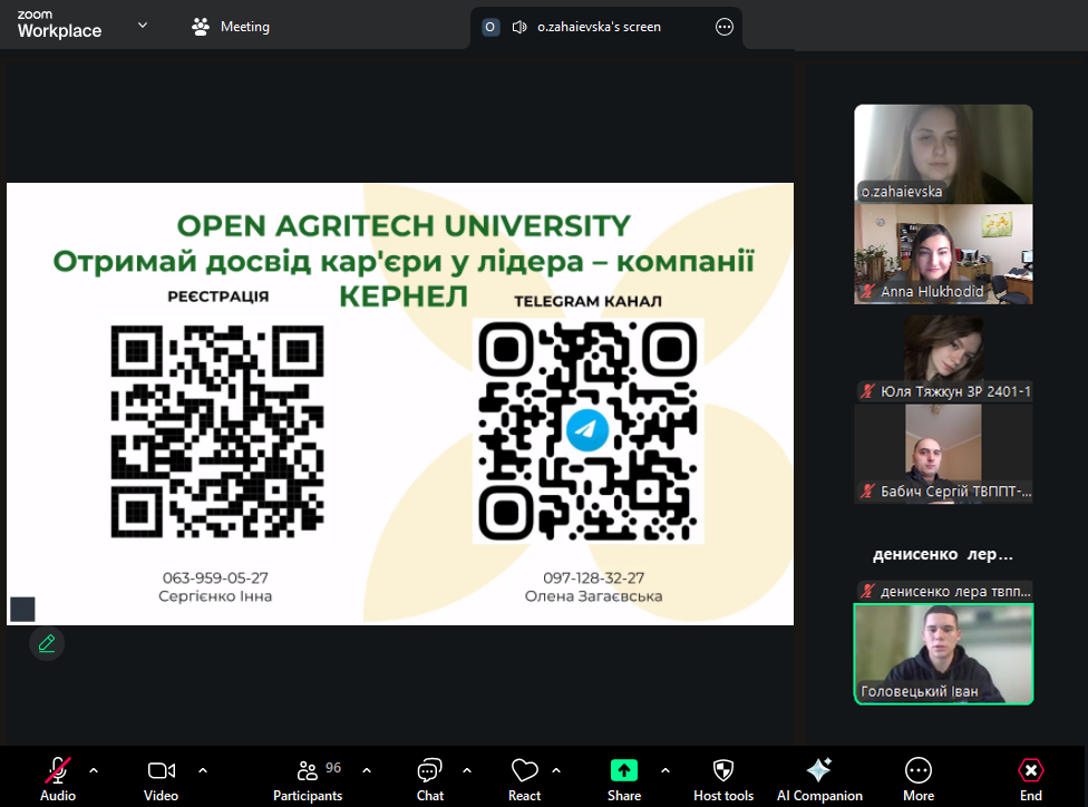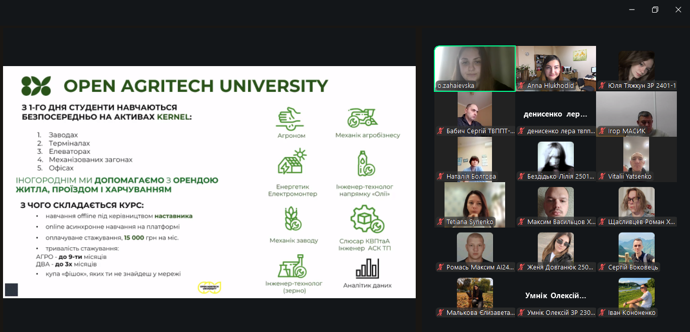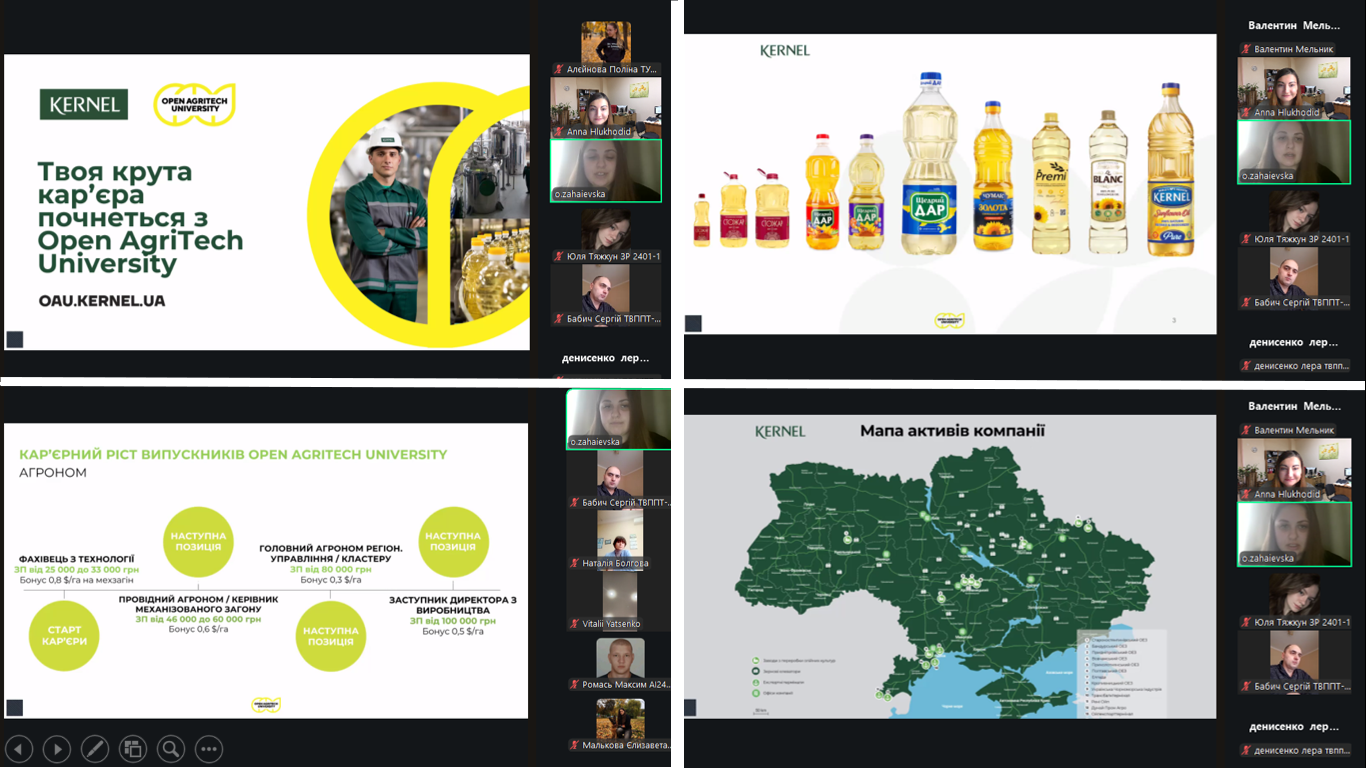 Спікером зустрічі від компанії «КЕРНЕЛ», виступила Олена ЗАГАЄВСЬКА, фахівець з управління знаннями агробізнесу. Під час зустрічі студенти дізналися про траєкторії кар’єрного зростання у компанії «КЕРНЕЛ», ознайомились із можливостями проходження практики з подальшим працевлаштуванням, участі у програмах дуальної освіти, участі у програмі Open Agritech University. Програма Open Agritech University триває 9 місяців і включає: офлайн-навчання під керівництвом наставника, онлайн-асинхронне навчання на спеціальній платформі, оплачуване стажування для студентів. Були представлені реальні історії успіху від учасників програми зокрема, Іван ГОЛОВЕЦЬКИЙ поділився власним досвідом участі у Проєкті, а приємним сюрпризом став виступ студента Сумського НАУ Валентина МЕЛЬНИКА, який нині працює лінійним агрономом компанії. Валентин розповів про переваги співпраці з «КЕРНЕЛ» та можливості набуття теоретичних знань і практичного досвіду ще під час навчання. На завершення заходу пані Олена провела активну вікторину. Найактивніші учасники, які правильно відповідали на запитання, отримали подарунки від компанії.